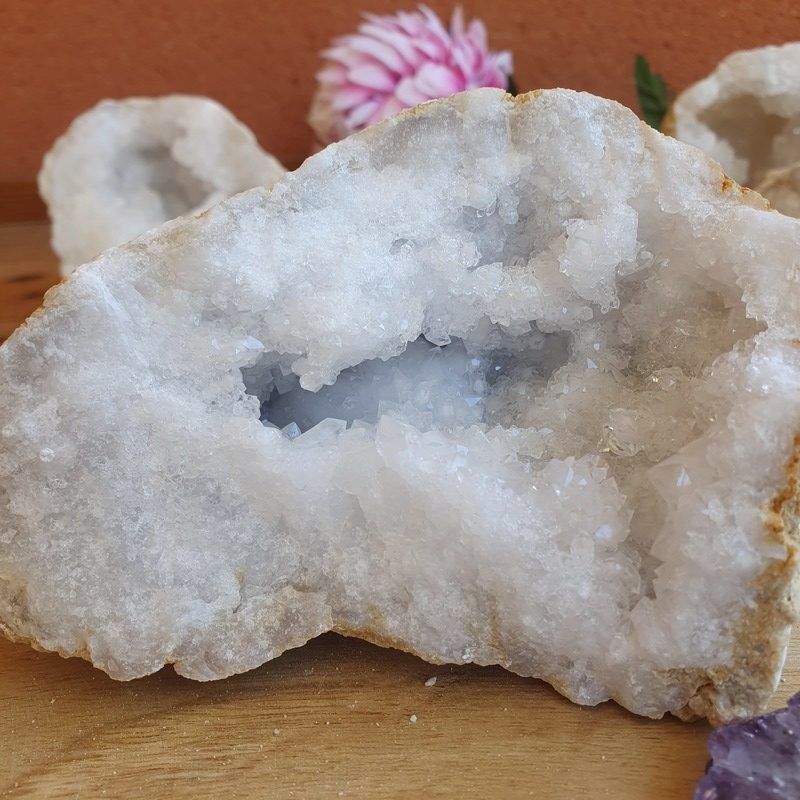 La géode de quartz est une cavité rocheuse tapissée d’une multitude de petits cristaux qui concentrent l’énergie de la pierre. C’est une quelque sorte un nid douillet dans lequel placer vos pierres pour qu’elles se régénèrent après la purification.